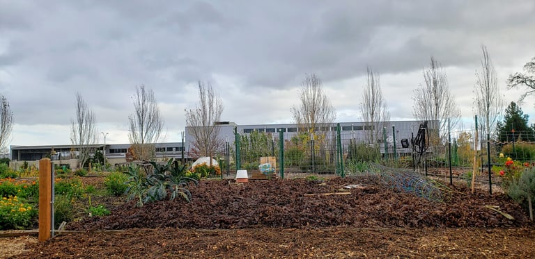 Soil tilled, chicken poop manure added and plant starts introduce. Garden requires daily watering and so much attention at this stage. Notice woodchip on pathways.